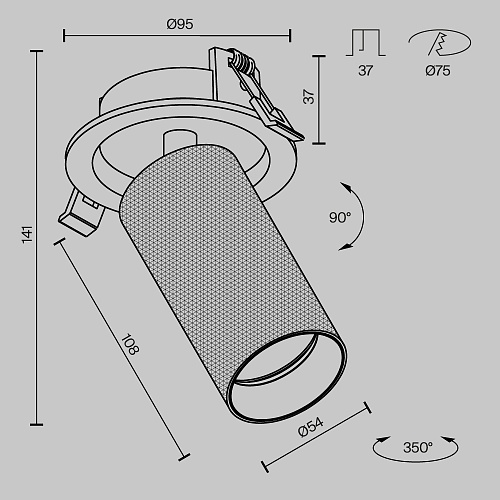 Отличительной особенностью серии является её графичная фактура, кольцо, которое фиксирует лампу светильника сделано вровень с краями лампы, что скрывает её кромку и делает вид светильника более эстетичным. Источник света в светильниках утоплен, так же к моделям можно докупить антибликовую решётку, что обеспечит низкий коэффициент слепимости. Серия представлена в трёх актуальных цветах: черный, белый и матовое золото в модификациях потолочные светильники – накладные, накладные-поворотные, со встраиваемой чашей; настенные светильники; подвесные светильники; трековые светильники для однофазного шинопровода; трековые светильники для магнитного шинопровода.