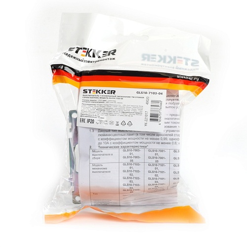 Характеристики Выключатель 1-клавишный (механизм), STEKKER GLS10-7103-04, 250V, 10А, серия Катрин, шоколад