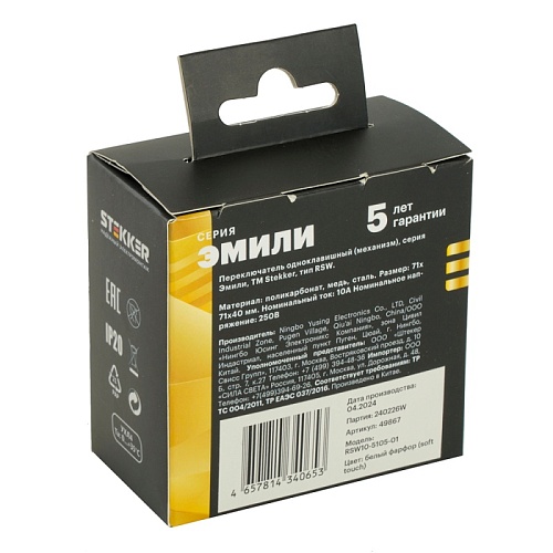 Характеристики Переключатель 1-клавишный (механизм), STEKKER, 250В, 10A, серия Эмили, RSW10-5105-01, белый фарфор, soft touch