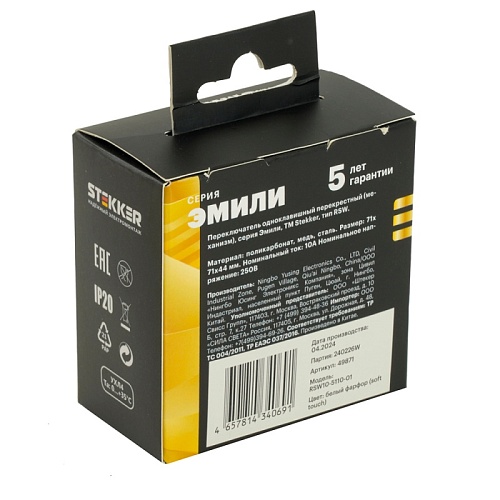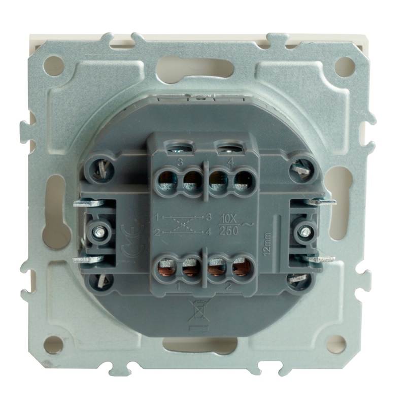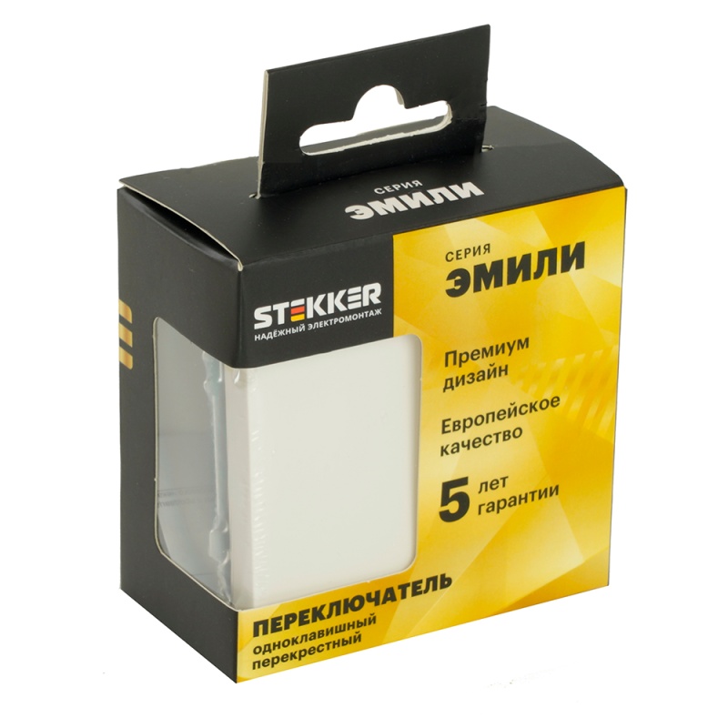 Характеристики Переключатель перекрестный 1-клавишный (механизм), STEKKER, 250В, 10А, серия Эмили, RSW10-5110-01, белый фарфор, soft touch