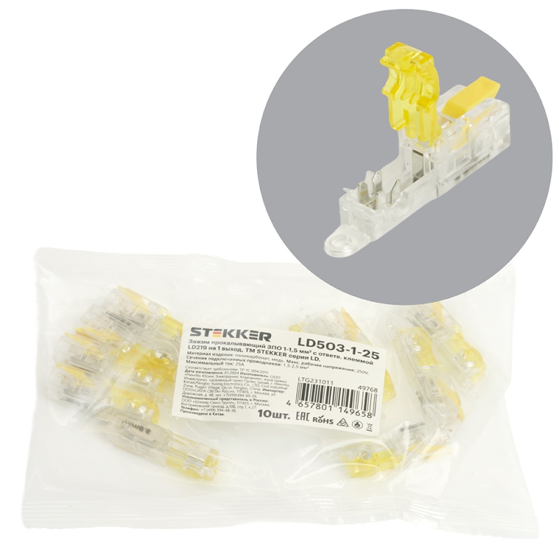 Зажим прокалывающий ответвительный 1,5-2,5 мм2 c ответвительной клеммой LD219 на 1 выход, прозрачный/желтый (упаковка 10 шт) LD503-1-25