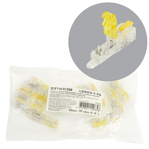Зажим прокалывающий ответвительный 1,5-2,5 мм2 c ответвительной клеммой LD219 на 1 выход, прозрачный/желтый (упаковка 10 шт) LD503-1-25 49768