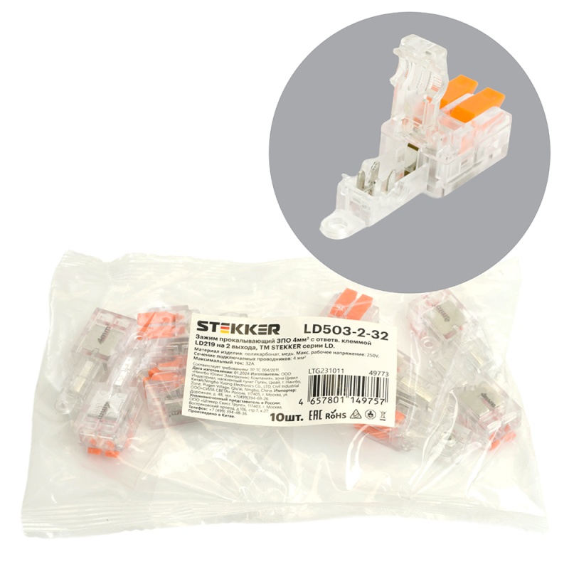Характеристики Зажим прокалывающий ответвительный 4 мм2 c ответвительной клеммой LD219 на 2 выход, прозрачный/оранжевый (упаковка 10 шт) LD503-2-32