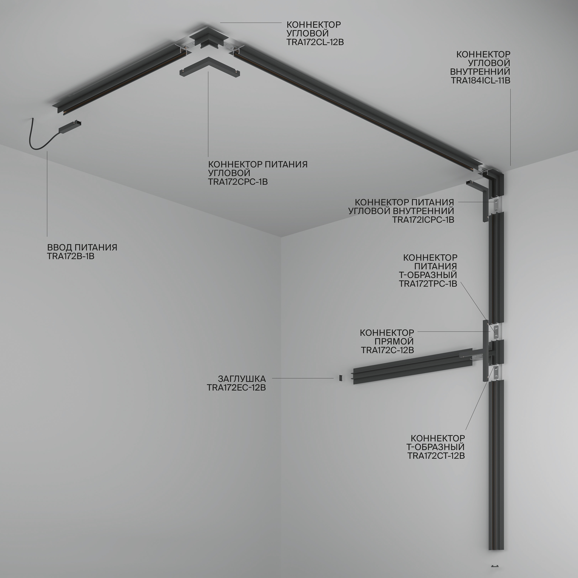 Состав трековой системы Трековая система Technical накладная низковольтная (48 Вольт) чёрная 300x300 TS-X-300-TR175-1-24WTW-M-B